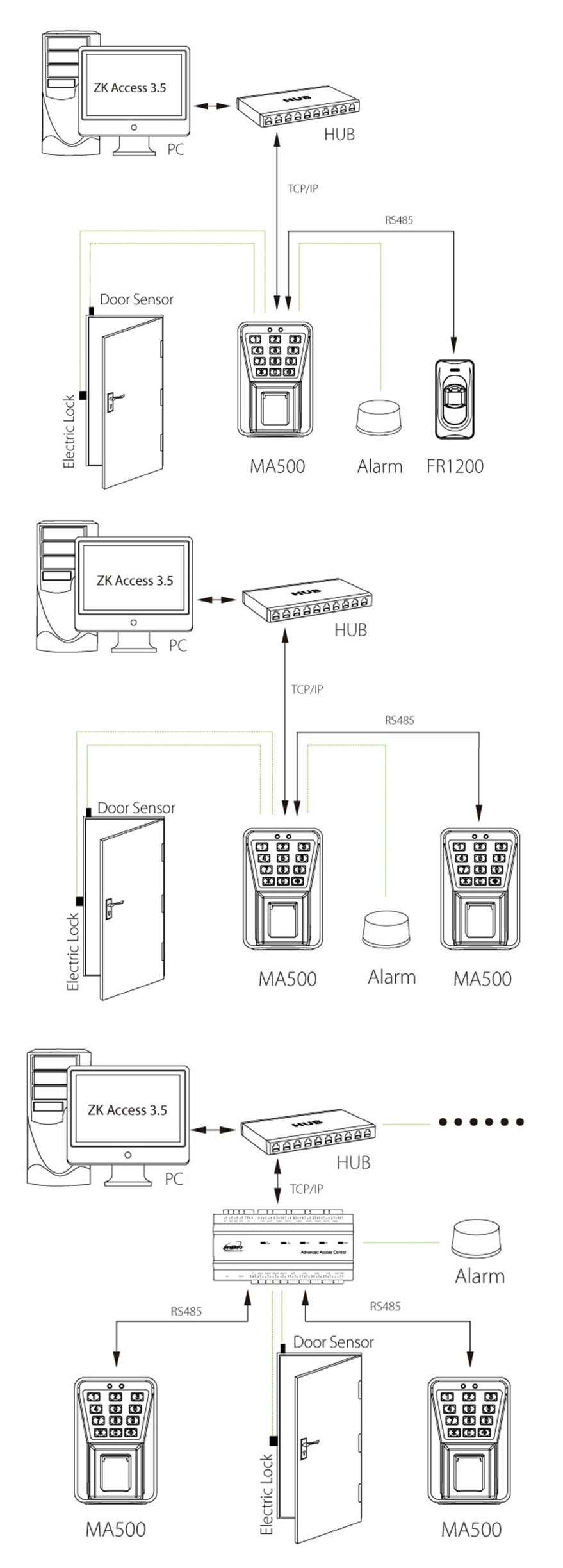 Apart from connecting with electric lock, door sensor, alarm and exit button, MA500 can perform as a wiegand fingerprint reader by any 3rd party control panels, namely, the network mode. It is value added and very easy to replace conventional proximity or keypad access control system by biometric technology.